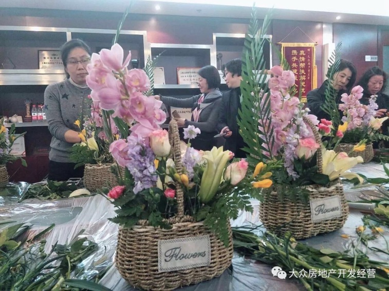 德扑之星房产金融工会为本次活动做了精心策划,为大家准备了康乃馨、百合、玫瑰、勿忘我等鲜花。各位女同胞们自己动手DIY艺术插花,并将这份饱含情意的艺术品带回与家人分享。这些象征了热爱、真情、高贵和喜悦的鲜花,寓寄了大家对新一年生活最美好的祝愿。本次活动,丰富了女职工的精神文化生活,提高了她们的生活热情,陶冶了她们的情操。德扑之星房产总经理张文华也饶有兴趣自始至终地参与了整个活动,由她精心制作的现场插花作品得到了现场辅导老师的好评!